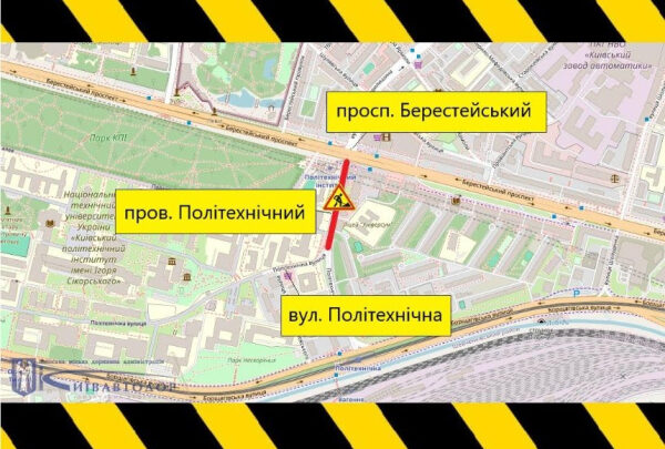 У п’ятницю, 26 липня, з 08:00 до 17:00 частково обмежать рух транспорту Політехнічним провулком — на ділянці від проспекту Берестейського до вулиці Політехнічної.