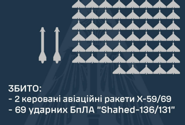Загалом по всій території України цієї ночі сили ППО збили 69 ударних БПлА типу “Shahed 136/139” та дві керовані авіаційні ракети X-59/69.