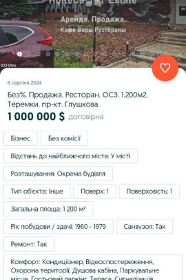 Оголошення з’явилось на OLX 6 серпня 2024 року. Продавець описав загальну площу ресторану, кількість посадкових місць та місткість автопарковки. Але жодного слова про мозаїку.