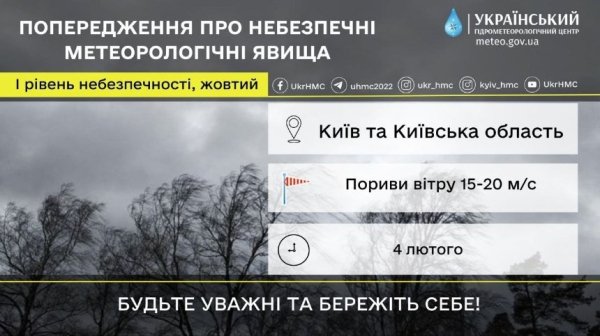 У неділю, 4 лютого, у Києві очікують пориви вітру 15-20 м/с (I рівень небезпечності, жовтий).
