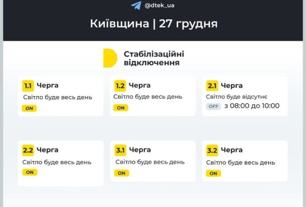 Тимчасові обмеження пов’язані з пошкодженням енергооб’єктів внаслідок масованої ракетно-дронової атаки 25 грудня.Стабілізаційні відключення у Києві 27 грудня: коли не буде світлаСтабілізаційні відключення у Києві 27 грудня: коли не буде світла